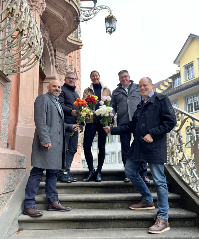 Ein starkes Trio für die Rosenwoche 2026. Hinten von links nach rechts: Thomas Weingart (Stadt Bischofszell), Nicole Laager (Fresh Food & Beverage Group) und Rolf Müller (Raiffeisen Amriswil Bischofszell) mit den beiden OK-Präsidenten Daniel Frischknecht und Adrian Rüegger (vorne von links nach rechts).